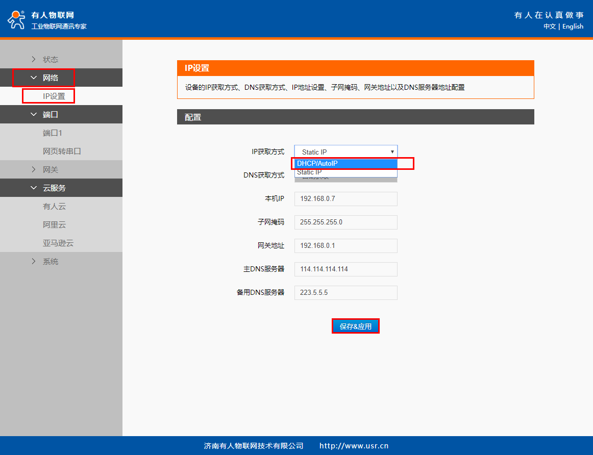 9、N510在“網絡”>“IP設置”界面中配置本機ip設置中,可以配置DHCP自動獲取或者設置靜態ip, 本案例配置為DHCP自動獲取IP,若需要配置510靜態IP上網的話可以自行設置靜態ip(Static IP)。