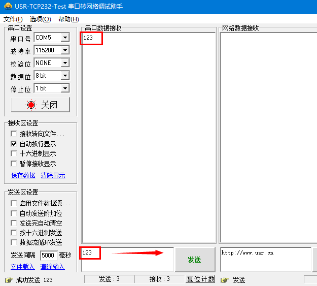 11、N510用485轉usb串口線接電腦,用串口調試助手打開,串口發送123,服務器回復123。
