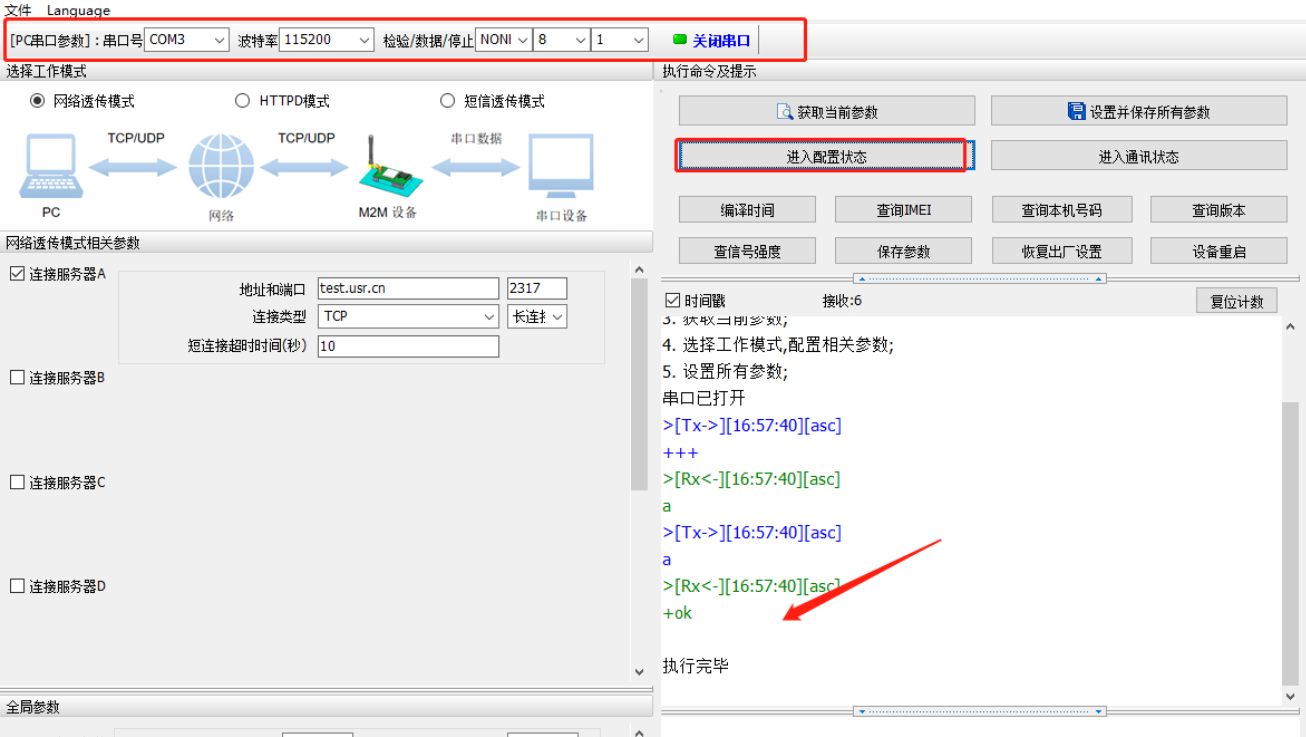 注:點擊進入配置狀態,如果模塊能返回+ok的字符,說明電腦和模塊連接是沒有問題的