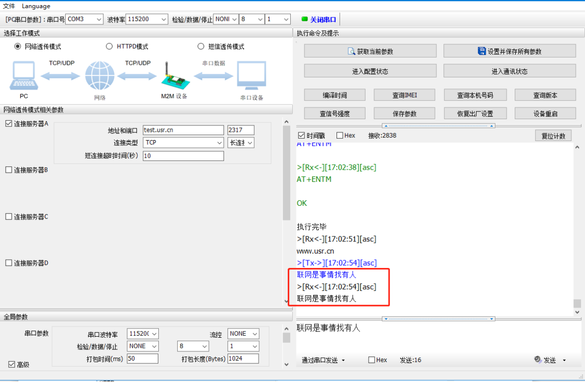 通過串口發送<聯網的事情找有人>,可以看到服務器返回了相同的內容,說明模塊工作是沒有問題的.