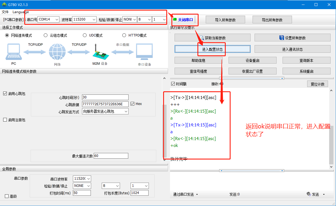 2. 默認參數是115200 N 8 1打開串口,進入配置狀態——返回OK說明進入配置狀態成功