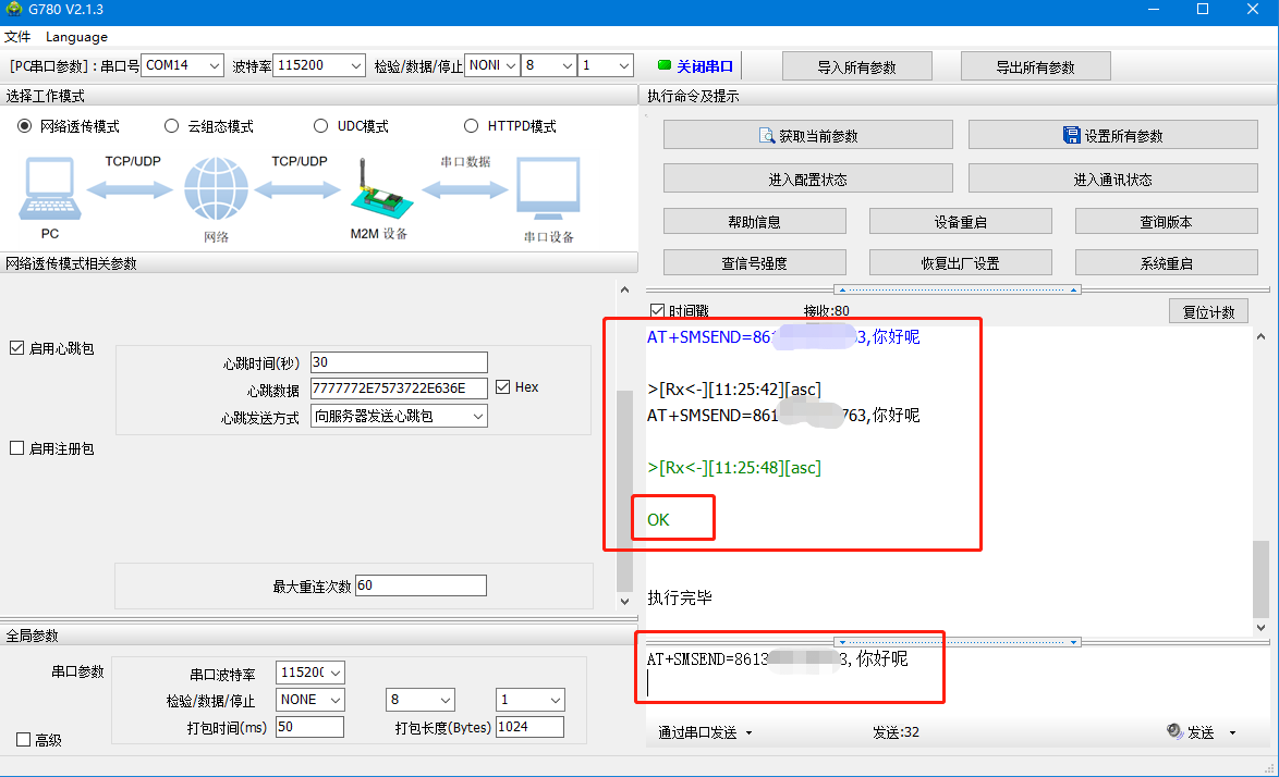 注:無論是 SMSEND 還是 CISMSSEND 指令都無法使用電信卡發送短信,因為設備頻段不支持電信 2G 網絡,所以無法使用電信的短信服務