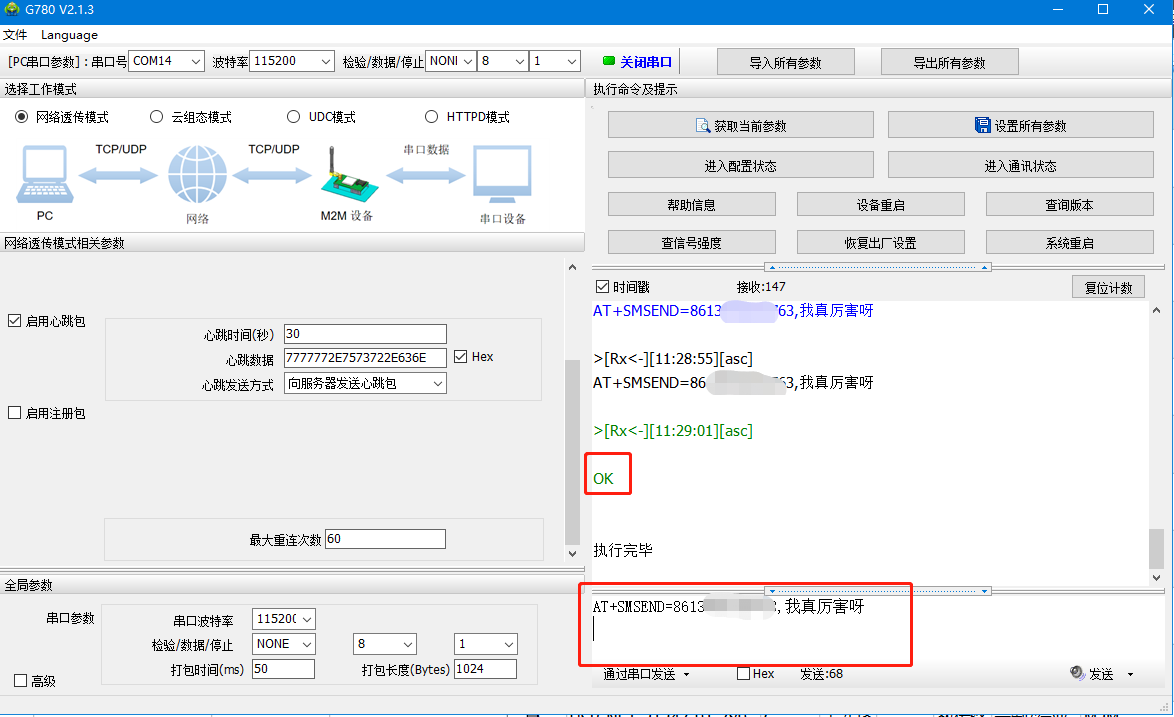 3. 在進入配置狀態下,發送AT+SMSEND=number,data{CR}或者AT+CISMSSEND=number,type {CR}(注意后面加回車),短信發送成功會返回+ok。