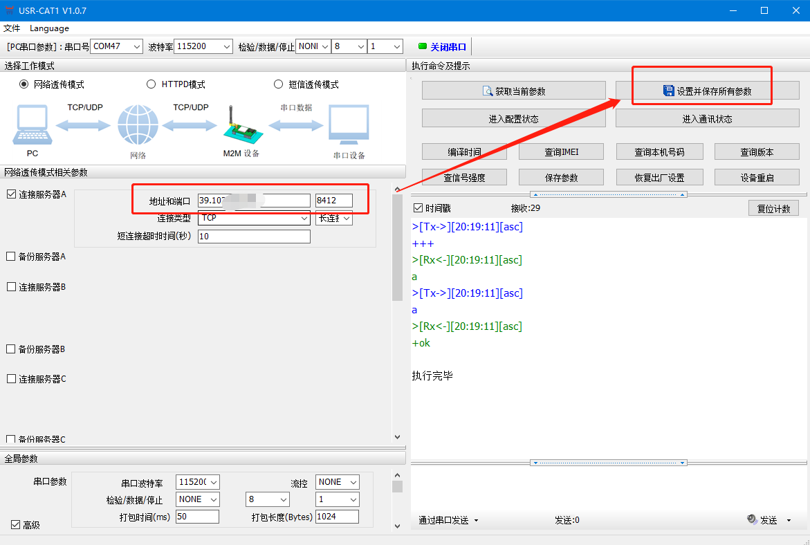 2>設置服務器A的地址和端口,修改參數后,設置并保存所有參數,等待模塊重啟成功。