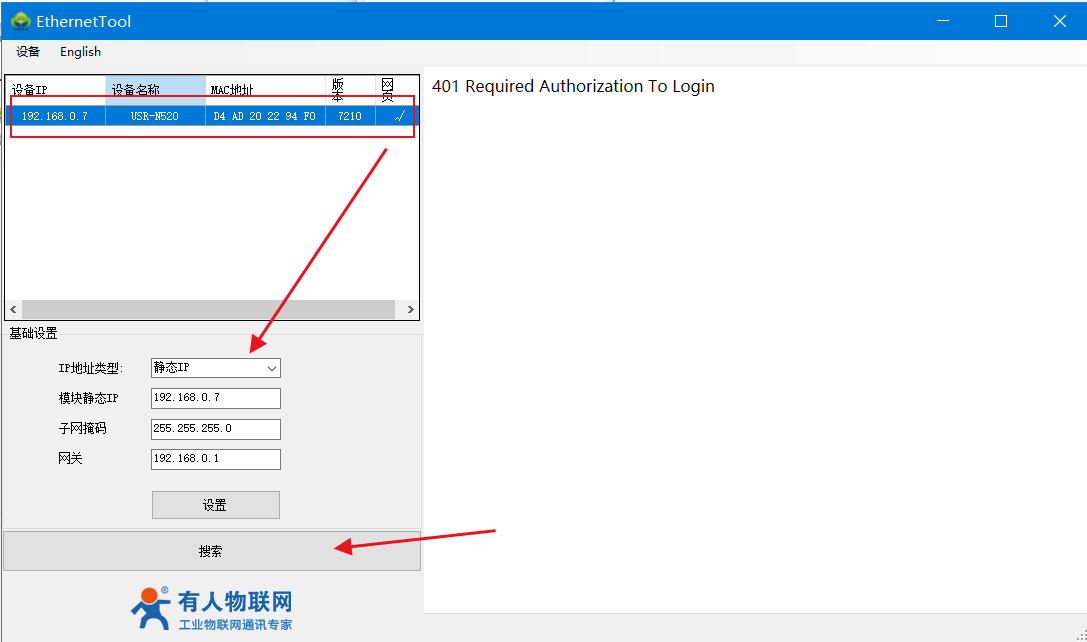 3、打開H7設置軟件,點擊搜索設備,點擊選中,可以看到IP地址為靜態IP。