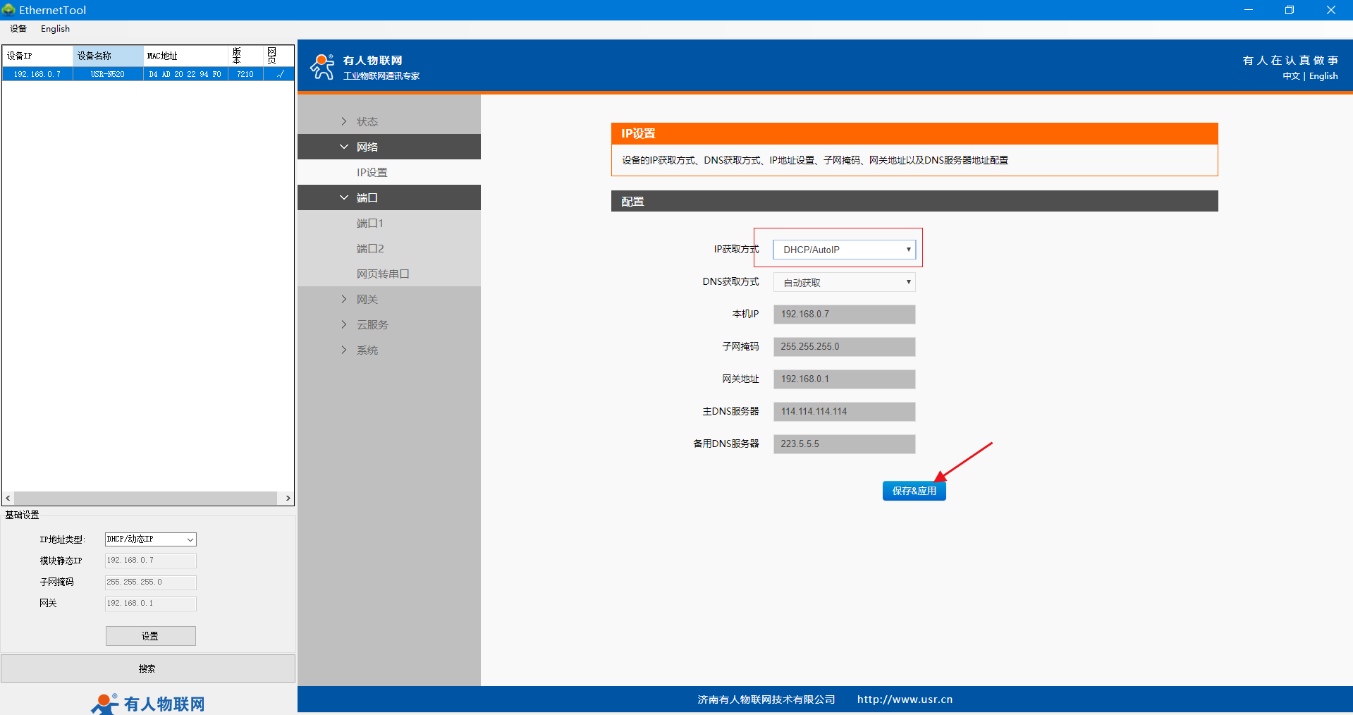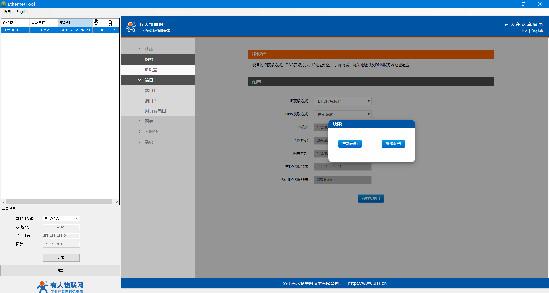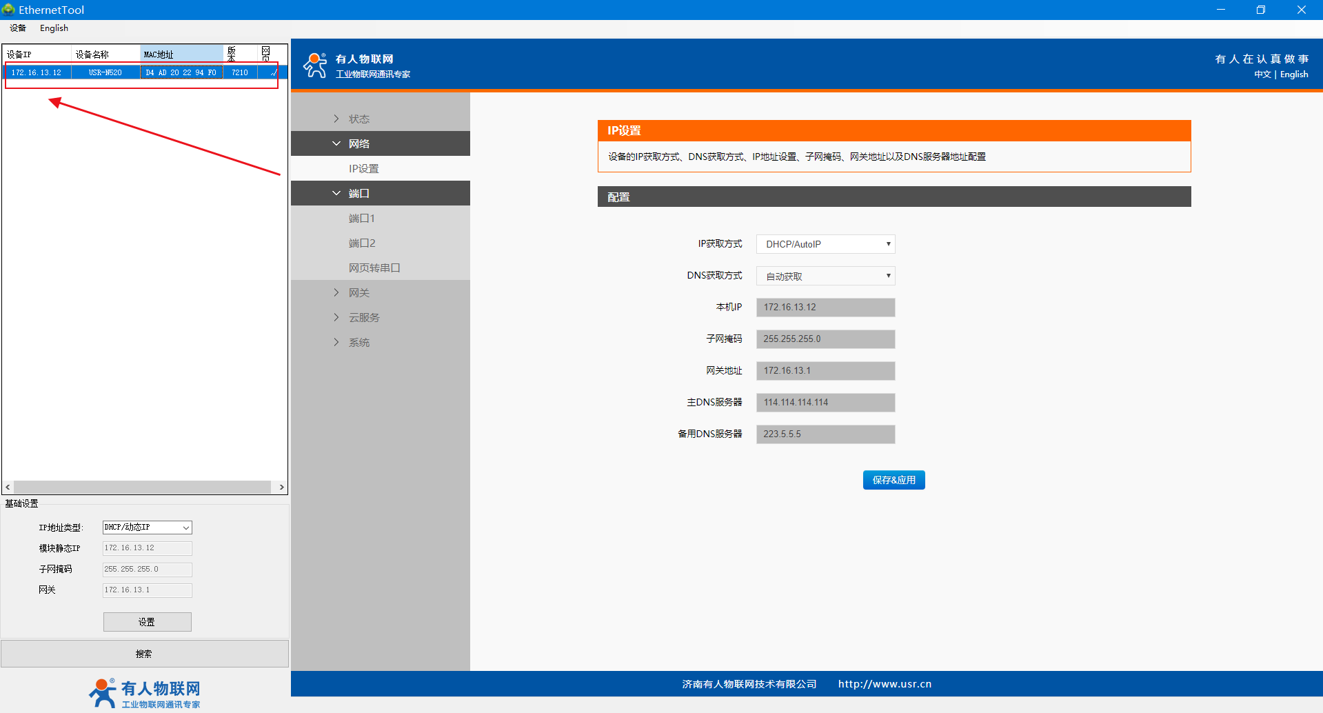 5、網線直連N520的網口和路由器的LAN口,保證N510正常上網,電腦連接路由器的WiFi,電腦和路由器同一網段,設置軟件重新搜索設備,可看到路由器分配給N510的IP。