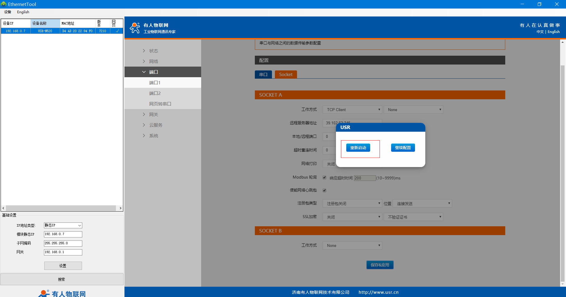 USR-N520-H7-6(二期)連接遠程服務器設置案例