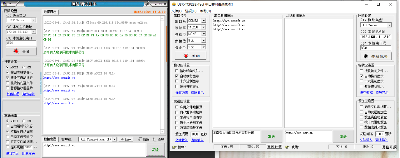 7、打開串口,串口參數和N520的串口參數保持一致,網絡端點擊鏈接,如下圖有連接對象顯示,網絡端和串口端互發數據測試。