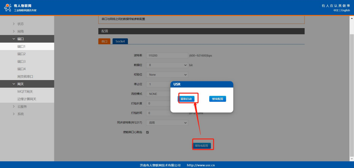 (3) 點(diǎn)擊“保存&應(yīng)用”,會彈出提示框,因此例中所有的配置項(xiàng)均已配置完成,所以點(diǎn)擊“重新啟動”,令配置生效。 設(shè)備中的所有功能,配置完成都需要點(diǎn)擊下方保存按鍵,最終需要重啟后生效。以下不再提示。