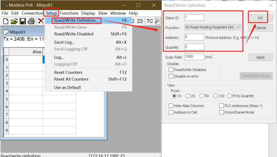使用 modbus Poll 模擬云端進(jìn)行查詢,“Connection”--“connect”界面配置連接參數(shù):