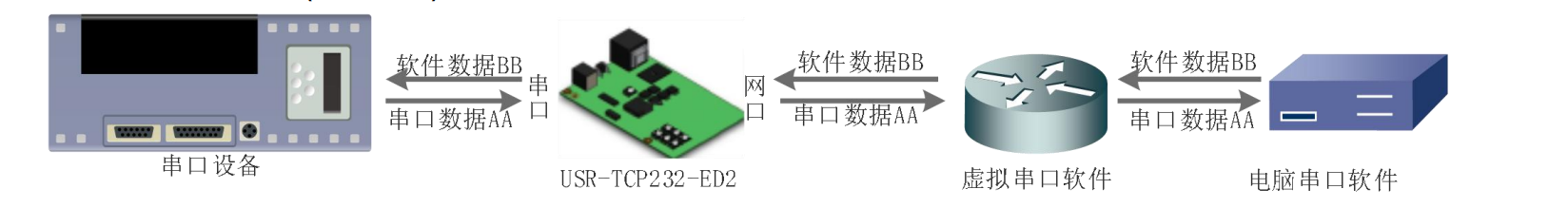 通過使用配套軟件 VCOM(虛擬串口),接收指定虛擬串口的數(shù)據(jù),然后把該數(shù)據(jù)以網(wǎng)絡(luò)數(shù)據(jù)的形式發(fā)送出去,從而解決 PC 端軟件為 串口方式而無法和聯(lián)網(wǎng)設(shè)備通訊的問題,方便用戶使用