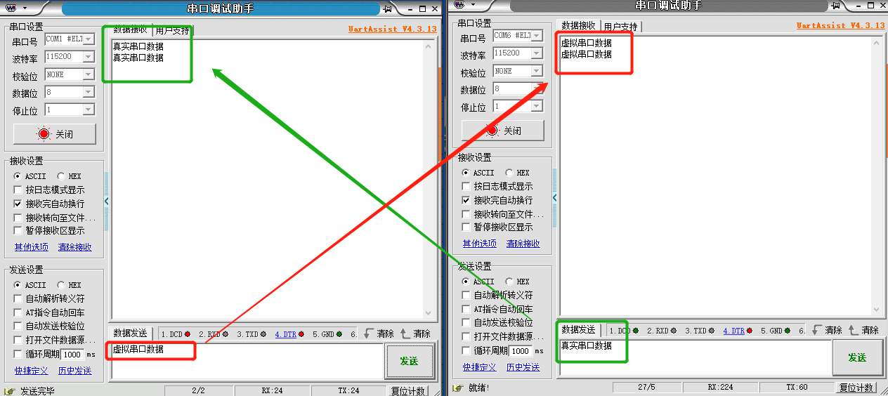 測試兩個串口之間的數(shù)據(jù)傳輸,就是ED2真實(shí)串口和虛擬串口之間的數(shù)據(jù)傳輸。