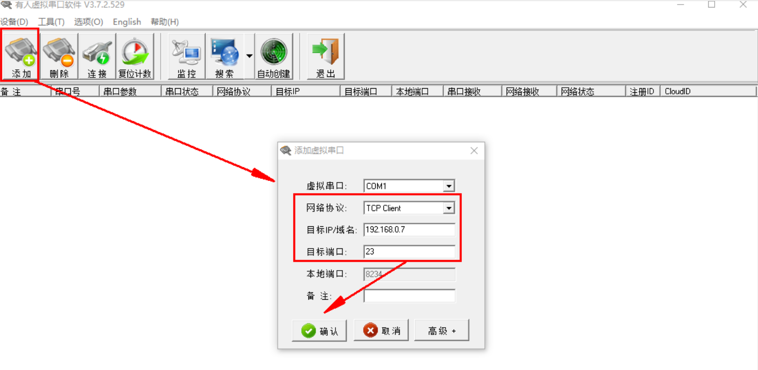 (1) 打開虛擬串口,設(shè)置點(diǎn)擊添加串口,選擇串口號為 COM1(選擇 COM 號一定要避開已經(jīng)存在的 COM 口) 網(wǎng)絡(luò)協(xié)議選擇 TCP Client,目標(biāo)域名/IP 設(shè)置成 ED2的IP,目標(biāo)端口號設(shè)置為 ED2 的端口號,備注填寫自己的設(shè)備名稱