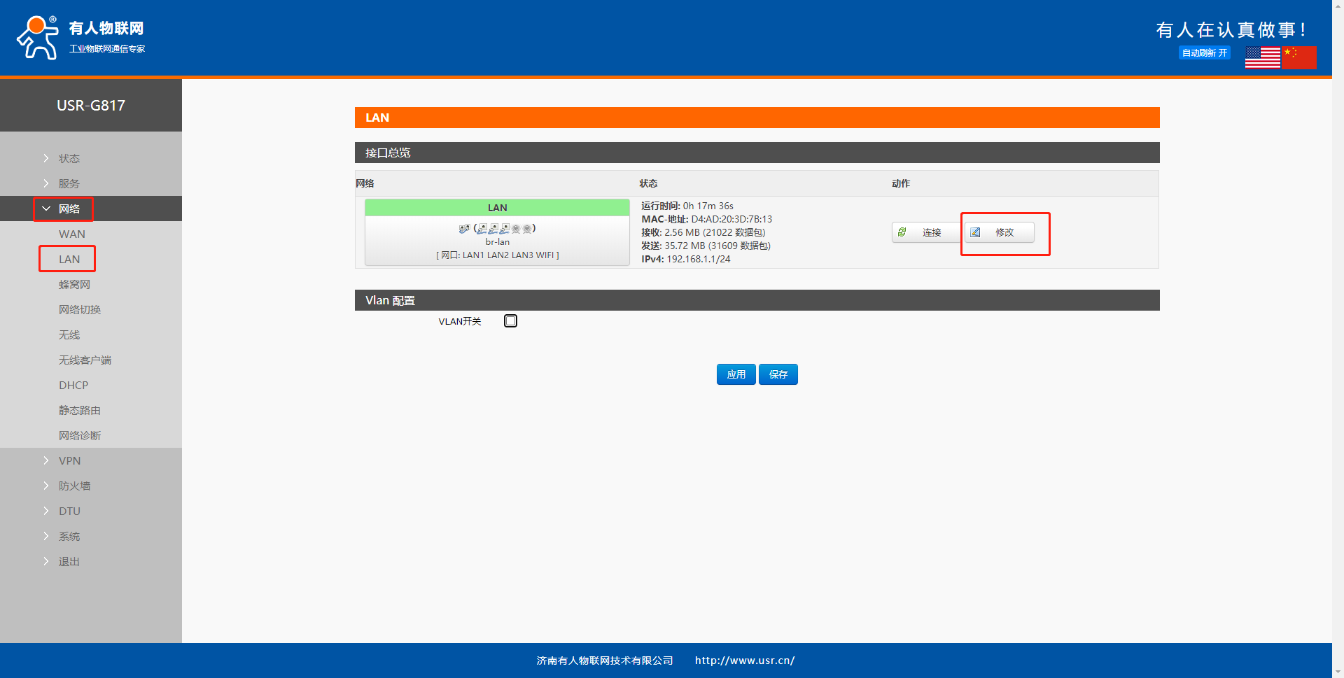 4、進入網絡-LAN界面可設置對應的VLAN網段