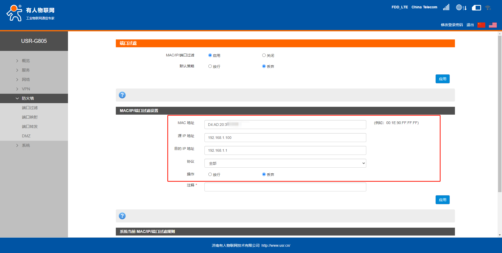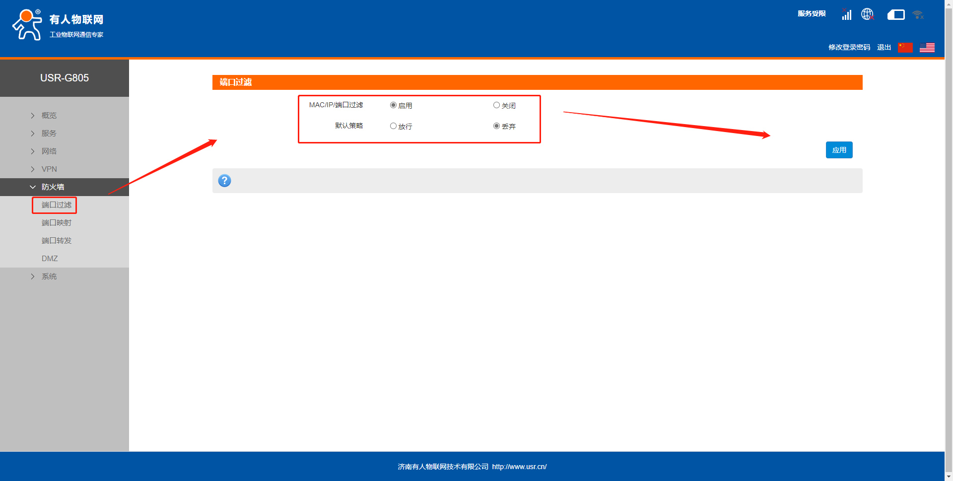 4. 在內置網頁--防火墻中端口過濾界面進行設置,啟用此功能之后點擊應用。