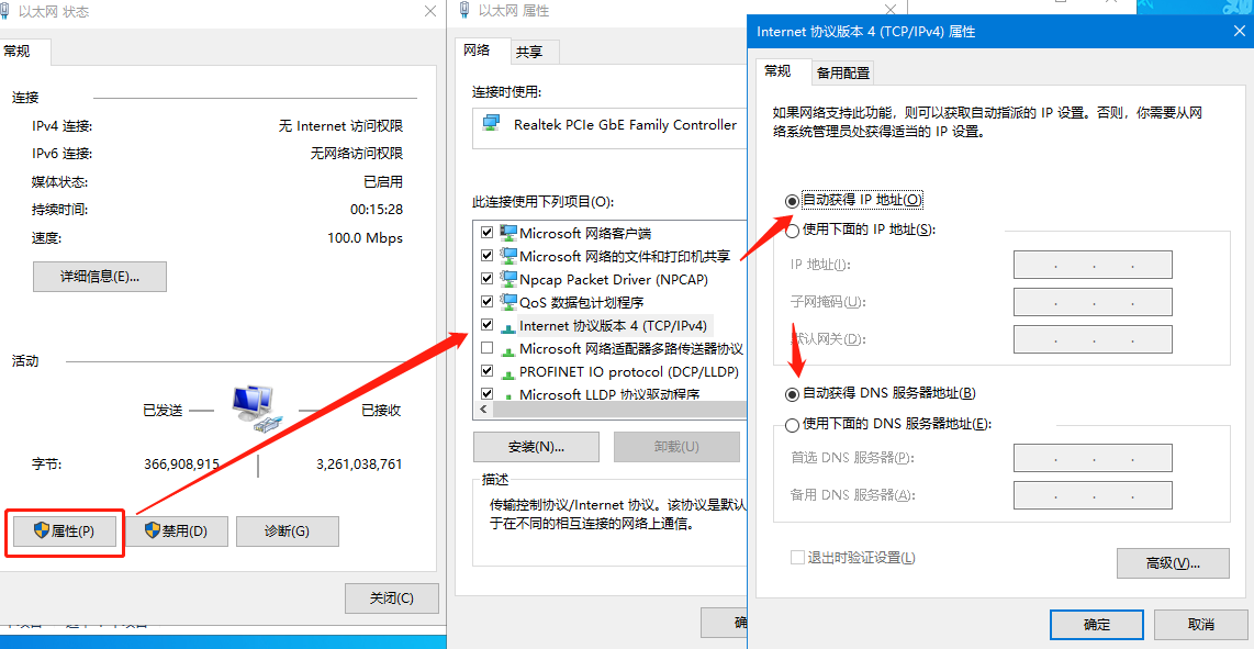 1.PC通過網線連接路由模塊的LAN口電腦配置網卡,雙擊該網卡選擇屬性,雙擊IPv4進入配置界面,勾選動態獲取之后點擊確定