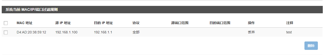 5.MAC和源IP地址設置連接805C 的下級終端的MAC和IP,目標IP設置禁止訪問的IP,協議選擇全部,操作設置丟棄,注釋自定義填寫。