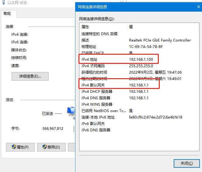 2.雙擊該網卡,點擊詳細信息,可以查看電腦獲取到的IP以及網關