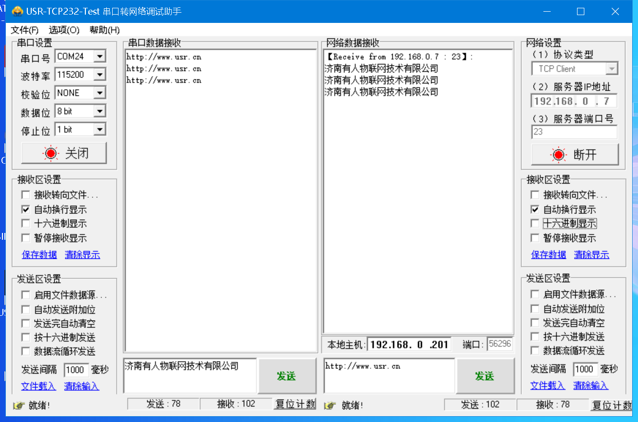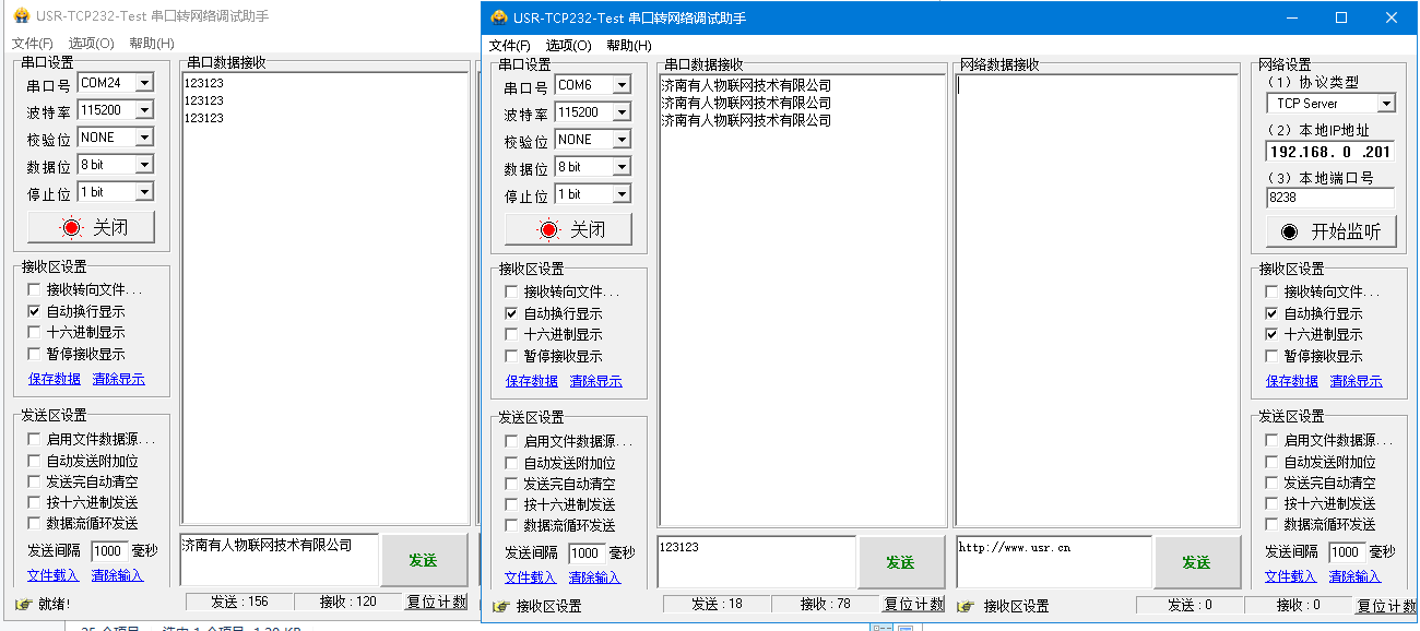 2、打開兩個USR_TCP232_Test軟件,一個連接COM24,一個連接虛擬串口COM6,實現兩個串口直接數據互發。