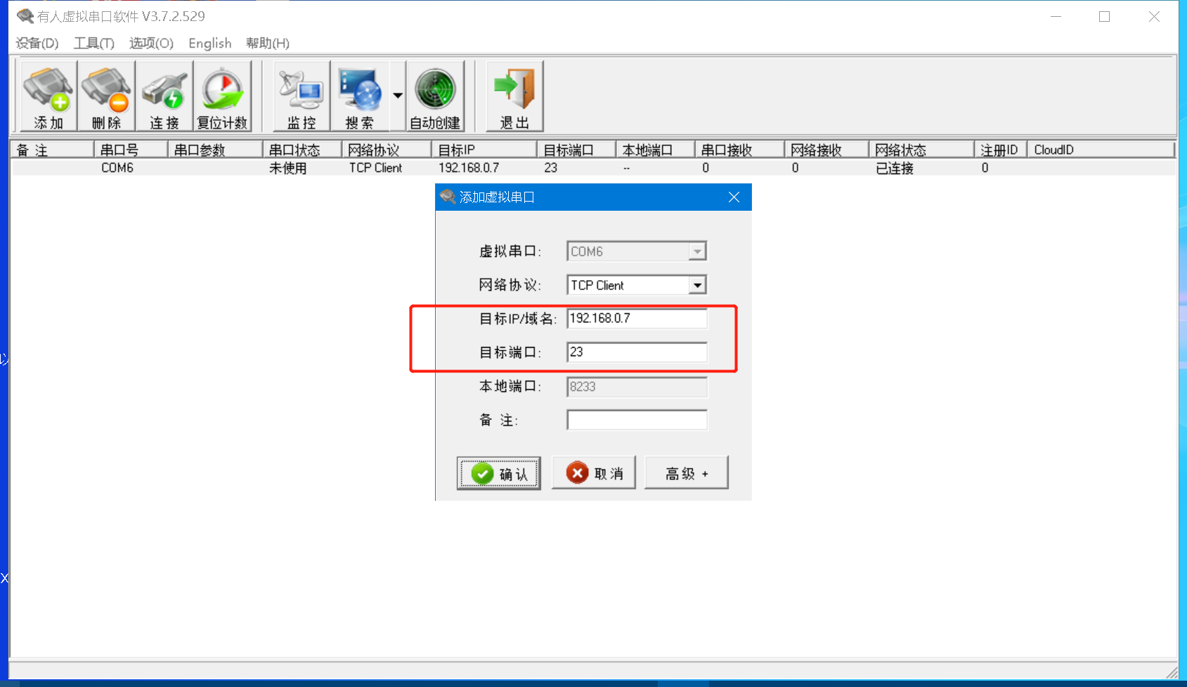 1、打開虛擬串口軟件,點擊“添加”在彈出的窗口中設置虛擬串口信息,由于上述ED2設備采用TCP server協議,所以此處網絡協議設置為TCP client。目標IP和目標端口與上述步驟中的電腦端設置一樣。然后點擊“確定”,建立虛擬串口COM6。