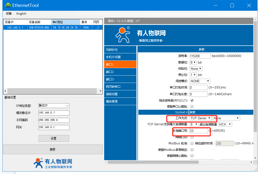 將軟件串口設置中的串口號配置為COM24。由于設備默認協議類型為 TCP server ,所以電腦端需要設置為 TCP client,IP和端口號為模塊的IP:192.168.0.7和端口號:23。