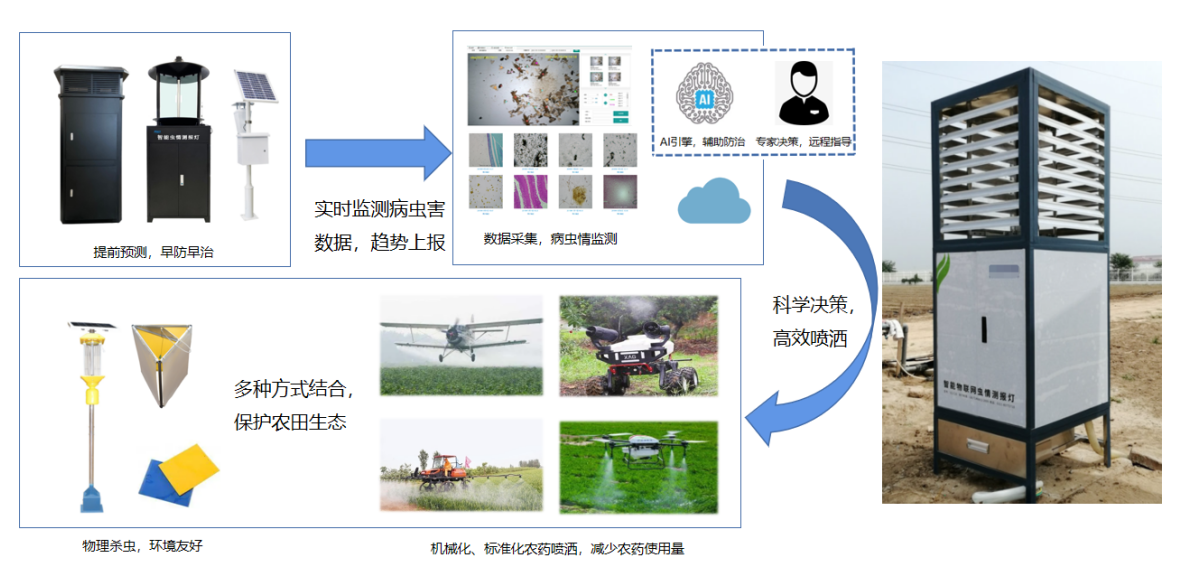 通過蟲情測報燈、智能孢子捕捉儀等智能儀器實時監測病蟲害情況,實時上報高清圖片,平臺通過AI圖像識別進行實時判斷,預測病蟲害發生情況,及時提醒,科學指導農藥配撒,減少損失;