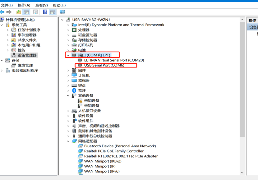 找到設備管理器,點擊端口,確認USB-RS232串口線的COM口號,有人的測試電腦是COM6