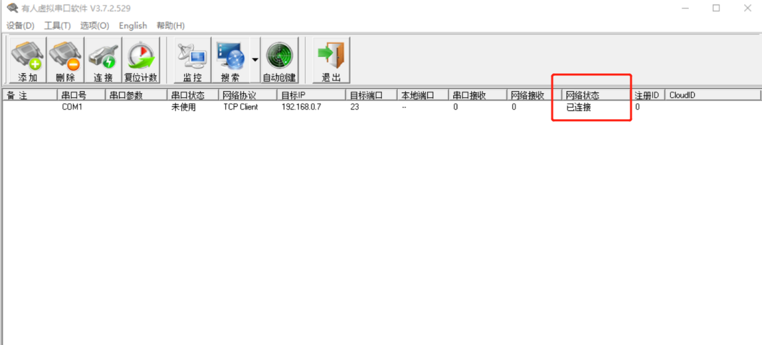 (1) 打開虛擬串口,設置點擊添加串口,選擇串口號為 COM1(選擇 COM 號一定要避開已經存在的 COM 口) 網絡協議選擇 TCP Client,目標域名/IP 設置成T0的IP,目標端口號設置為 T0的端口號,備注填寫自己的設備名稱