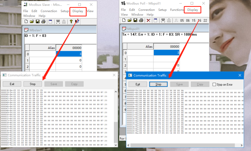 備注:MODBUS SLAVE軟件和MODBUS POLL軟件的選項Display,點開之后,最下面的Communication Traffic,是兩個軟件數據監控,可以查看MODBUS 數據,是否正常。