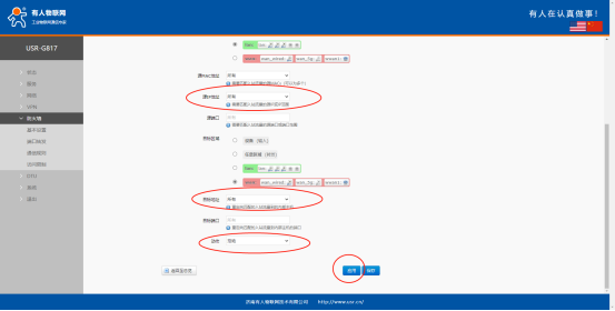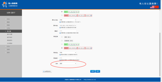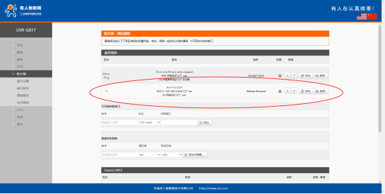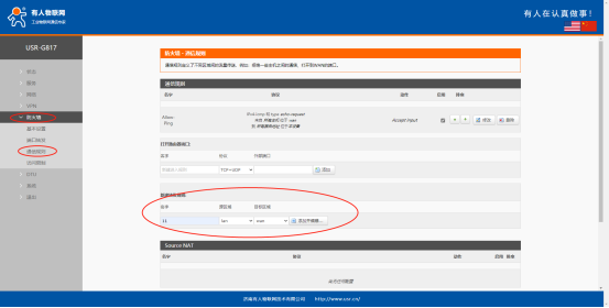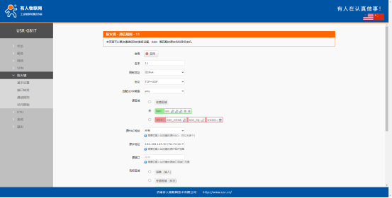 4、設(shè)置白名單:頁(yè)面跳轉(zhuǎn)到下圖,源區(qū)域選擇 lan,源 MAC 地址和源地址都選擇所有(如果是允許局域網(wǎng)內(nèi)的特定 IP 訪問(wèn)外網(wǎng)的特定 IP, 則此處需填寫 IP 地址或是 MAC 地址)。