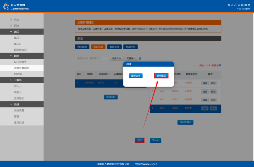 點擊“添加數據點”,分別新建DI1、DI2點位。點擊“保存”-“繼續配置”。