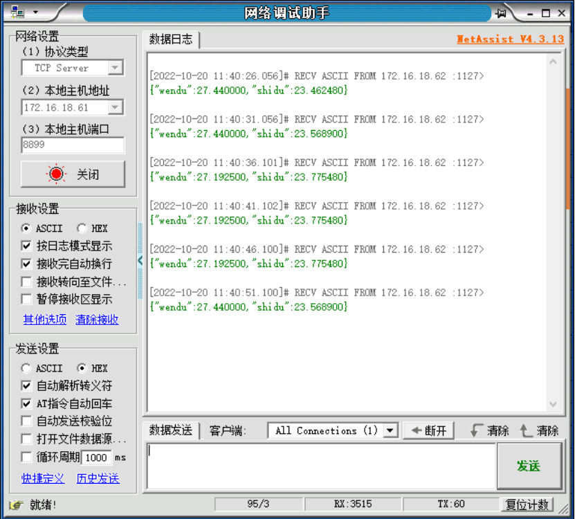 本次我們只上報溫度與濕度的值,全英文格式:{"wendu":"AI1","shidu":"AI2"}
