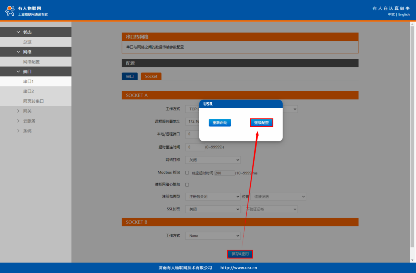 本案例測試服務器為我司 TCP服務器測試,用戶測試時請在“端口”>“串口1” >“ Socket”界面配置自己TCP服務器的參數。