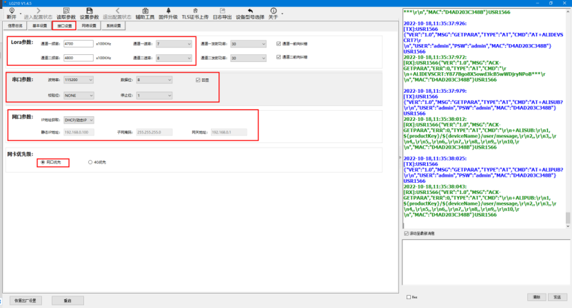 5、在接口設(shè)置中,配置Lora參數(shù)中通道一與通道二的頻率與速率參數(shù)不要一致就可以了,此處通道一二頻率分別為4700x1000Hz、4800Hz,速率分別為7、8。