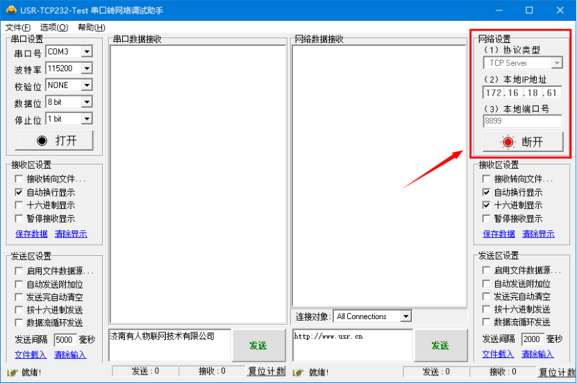 在USR-TCP232-Test軟件,的串口端打開101的串口, 可測試通信。