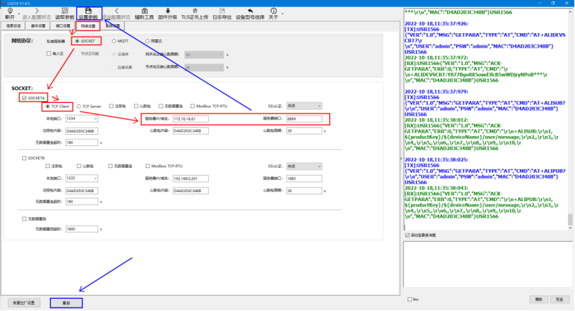 服務(wù)器IP/配置為服務(wù)器電腦的IP,服務(wù)器端口配置為服務(wù)器的端口號8899,點擊“設(shè)置參數(shù)”,點擊重啟設(shè)備,待設(shè)備重啟,服務(wù)器可以監(jiān)聽到該LG210連接。