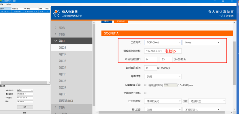 在“端口”>“端口1”界面中的“Socket”配置Socket A的工作模式為“TCP Client”