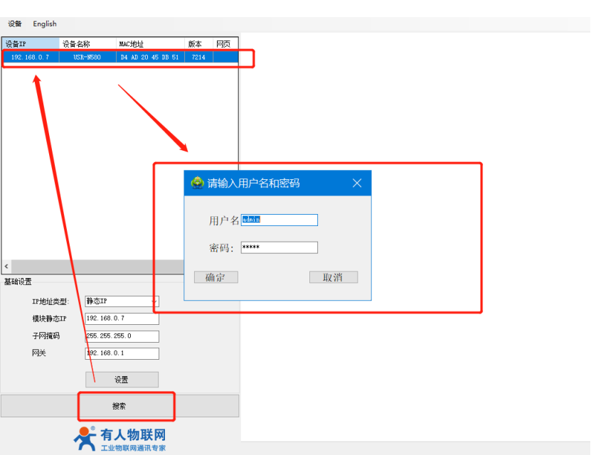 用H7系列配置軟件搜索N580設備,單擊搜索,搜搜到設備后雙擊設備。