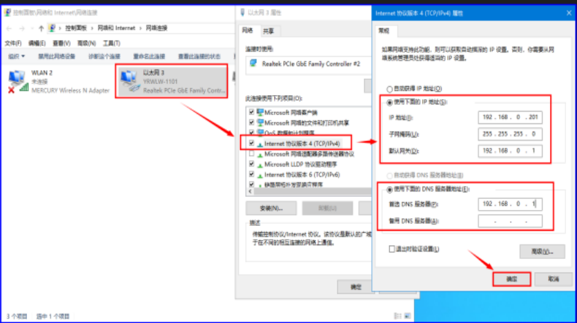4、電腦:控制面板\網絡和 Internet\網絡連接,IP設置和N580 IP同網段,N580默認IP是192.168.0.7,網關192.168.0.1,將電腦本地連接IPv4設置靜態IP,192.168.0.201,子網掩碼255.255.255.0,網關192.168.0.1。