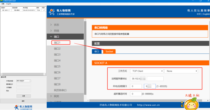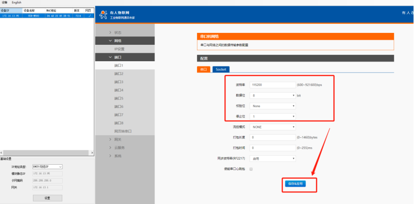 點擊端口1---串口,需要把波特率、數據位、校驗位、停止位跟串口終端設備保持一致; SOCKET參數里,選擇“TCP Client”,用戶在使用時不可以依照此ip與端口來進行配置,需要連接自己服務器的ip與端口。