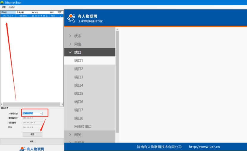 用H7系列配置軟件搜索N580設備,單擊搜索,將IP地址獲取方式從靜態 IP改為DHCP,保存設置,單擊搜索,找到設備之后,單擊產品名稱信息彈出輸入用戶名admin和密碼admin,點擊確定。在右上角點擊中英文切換