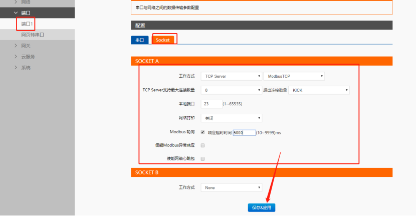 工作方式設(shè)置TCP server ModbusTCP,本地端口號默認是23,Modbus TCP輪詢默認是關(guān)閉,需要勾選開啟MODBUS TCP輪詢。