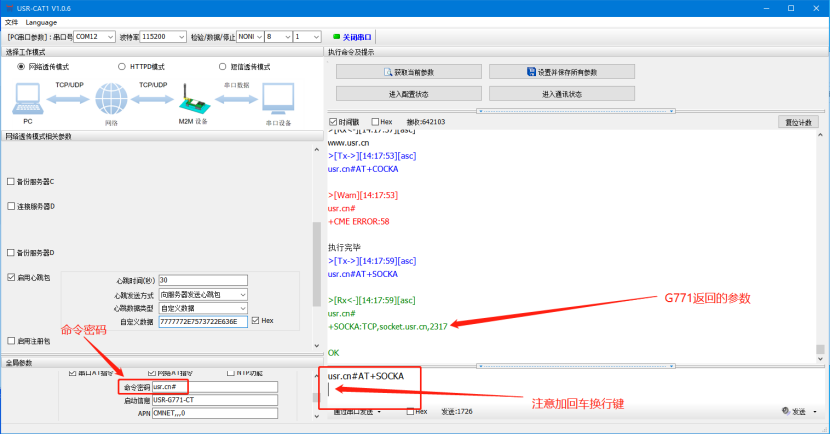 2>發送usr.cn#AT+SOCKA,AT指令最后一定要加回車換行