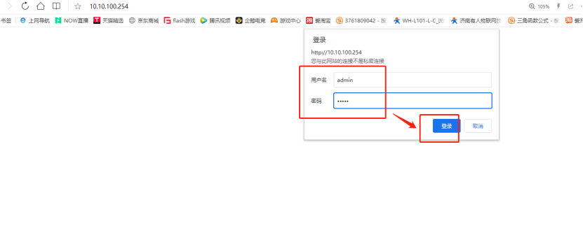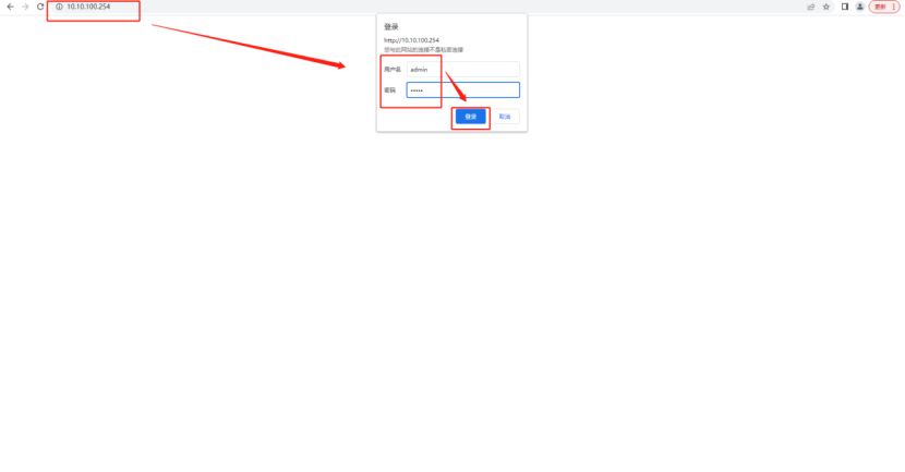 1)電腦連接1號w610的WiFi,瀏覽器打開輸出出廠默認IP:10.10.100.254,用戶名和密碼都是:admin,進入內(nèi)置網(wǎng)頁