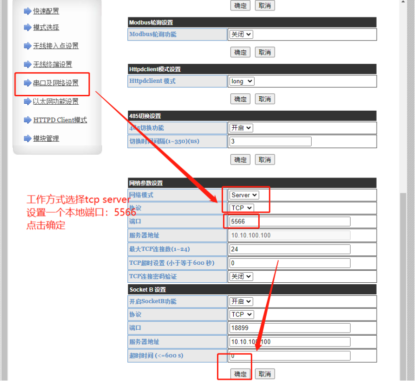 3)在串口及網(wǎng)絡設(shè)置,波特率等參數(shù)修改成和要接的串口設(shè)備一致。(這里測試修改成9600),點擊確定。工作模式設(shè)置TCP server,設(shè)置本地端口:5566,點擊確定。