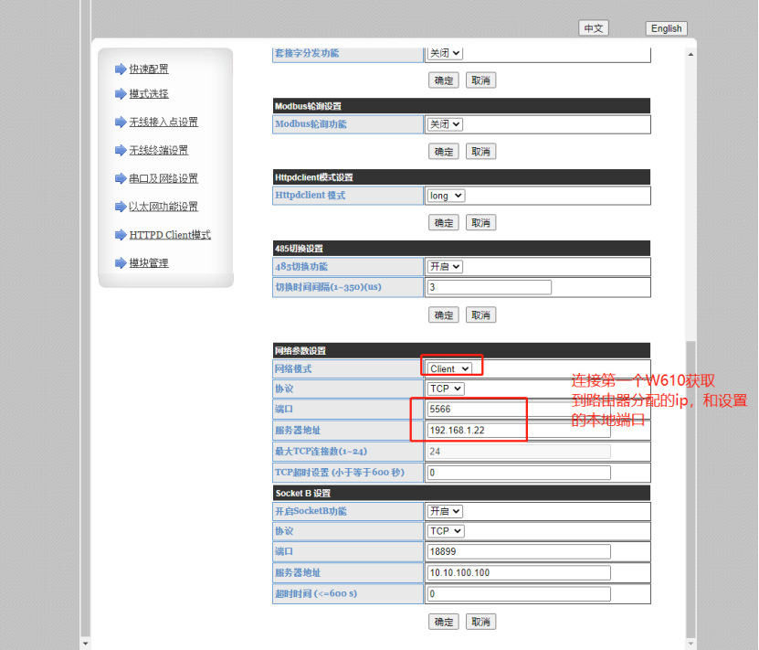 4)工作方式選擇tcp client,去連接1號w610獲取到的ip:192.168.1.22和設(shè)置的本地端口:5566,點擊確定。