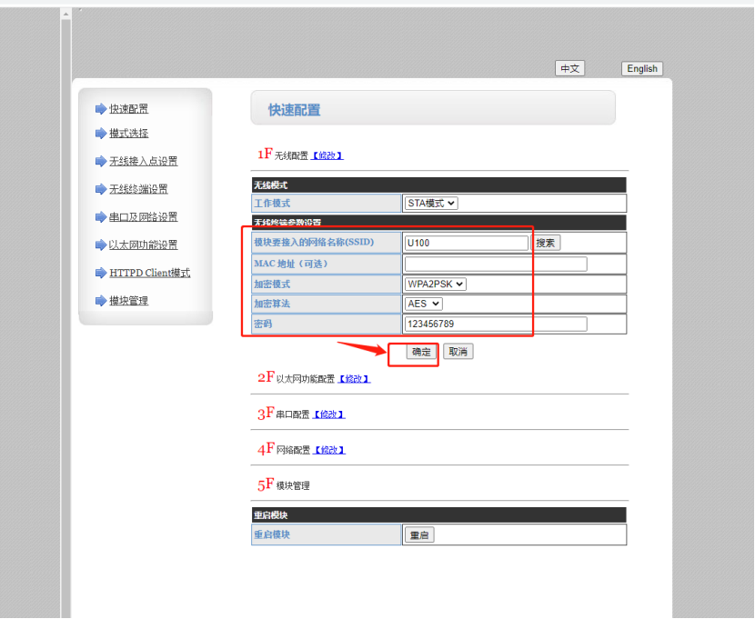 2)USR-W610設(shè)置STA模式,連接路由器的WiFi,填上密碼,點擊確定
