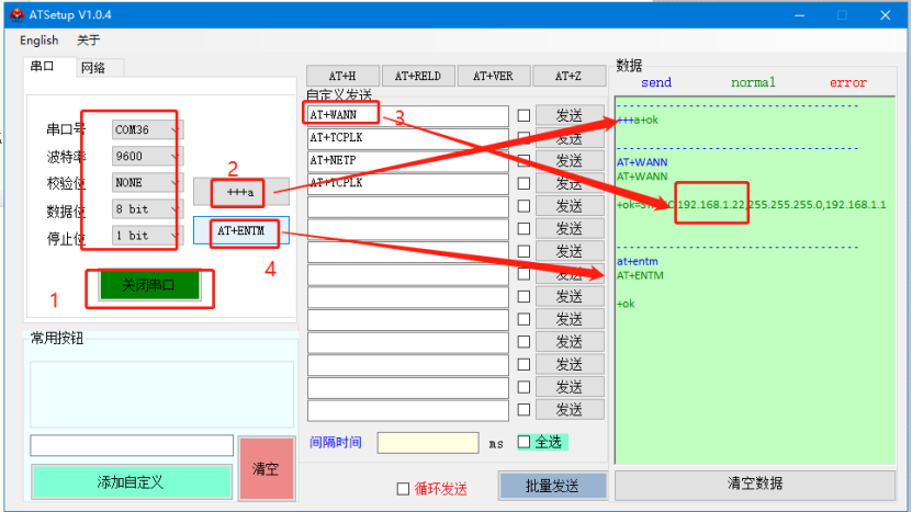 5)用ATSetup軟件按照修改后的波特率打開第一個w610的com口,點擊+++a進入配置狀態(tài),返回a+ok,說明進入配置狀態(tài)成功,發(fā)送AT+WANN查詢獲取到路由器分配的ip:192.168.1.22,查詢完畢,點擊AT+ENTM進入通信狀態(tài)。