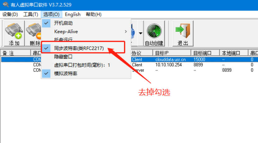 點(diǎn)擊“選項(xiàng)”,取消勾選“同步波特率(類RFC2217)”即可。本功能默認(rèn)為開啟。