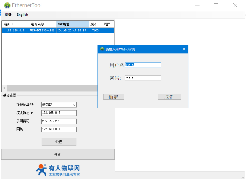 2、打開H7設(shè)置軟件,點(diǎn)擊搜索設(shè)備,點(diǎn)擊選中。雙擊IP地址,輸入用戶名admin,密碼admin,進(jìn)入410s的內(nèi)置網(wǎng)頁。點(diǎn)擊右上角切換至中文模式。